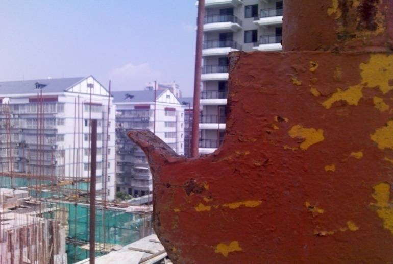 上图为外脚手架与施工电梯卸料平台图片,下列关于卸料平台搭设说法正确的是()。