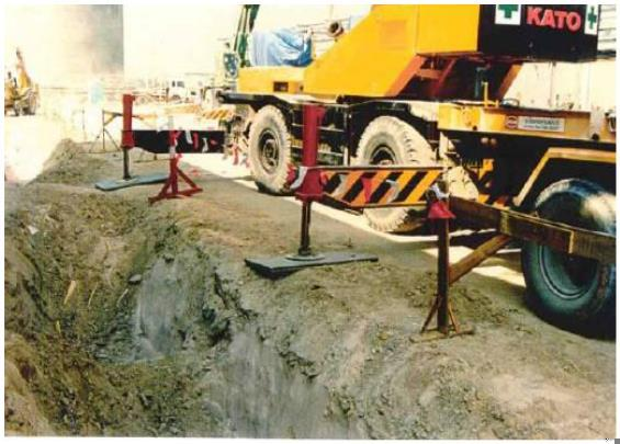 B. 起重机支腿支在沟沿边上